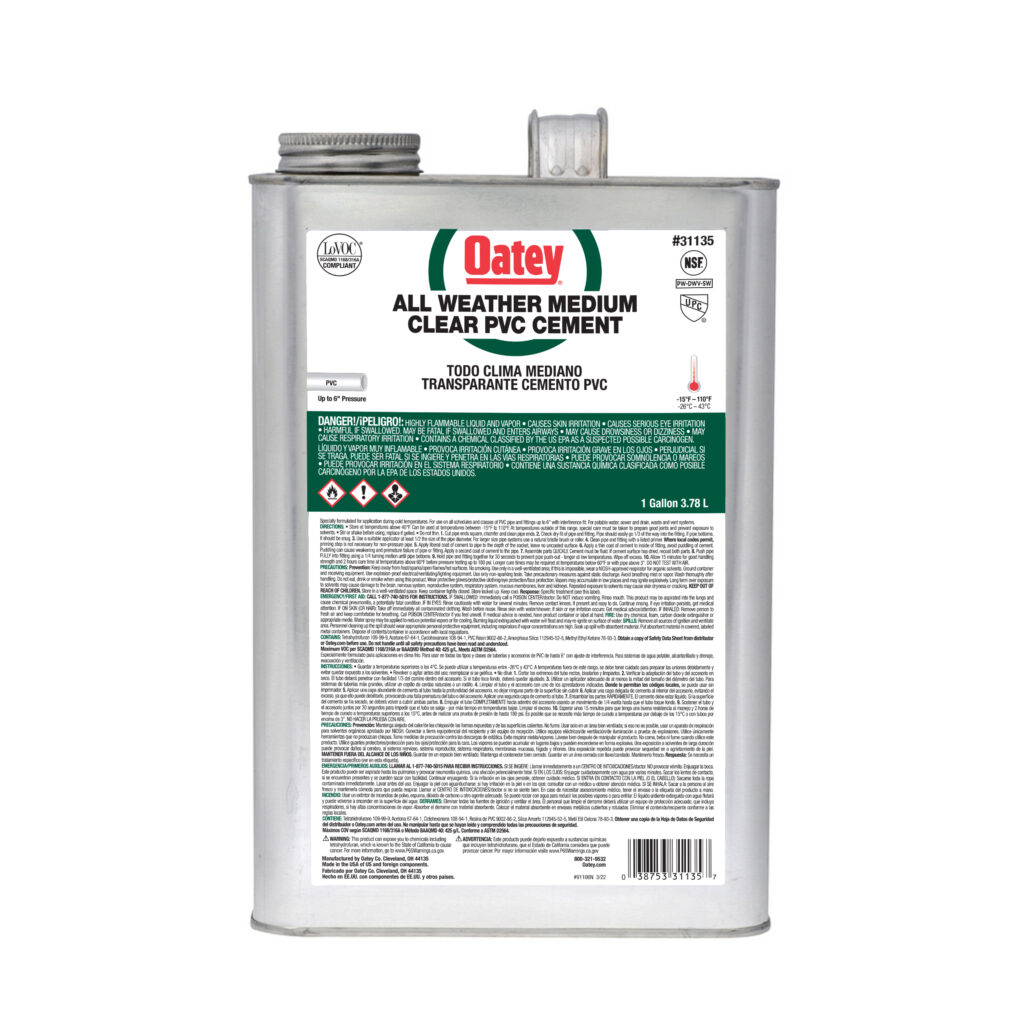 Oatey® PVC All Weather Medium Bodied Fast Set Clear Cement jest zalecany do zastosowań w instalacjach wody pitnej, odpływowych, kanalizacyjnych i wentylacyjnych. Został opracowany z myślą o pracy w każdych warunkach pogodowych od -15°F do 110°F i łatwo się nakłada za pomocą dołączonego dozownika. Ten przezroczysty, średniotwardy, szybkowiążący cement może być stosowany do spawania rozpuszczalnikowego wszystkich rodzajów i klas rur i kształtek z PVC o średnicy do 6 cali z dopasowaniem wciskowym. Produkty Oatey cieszą się zaufaniem profesjonalistów z branży hydraulicznej od ponad 100 lat