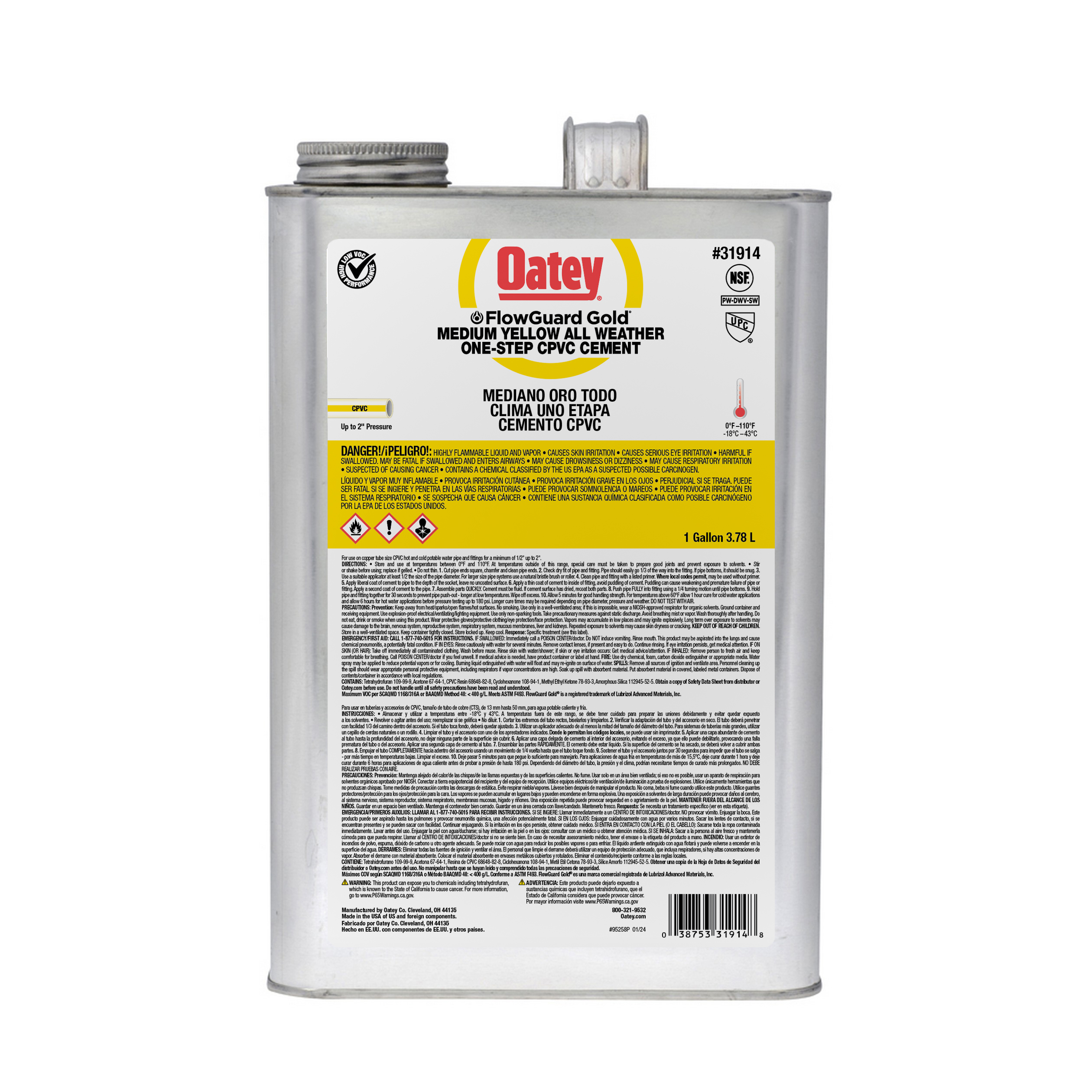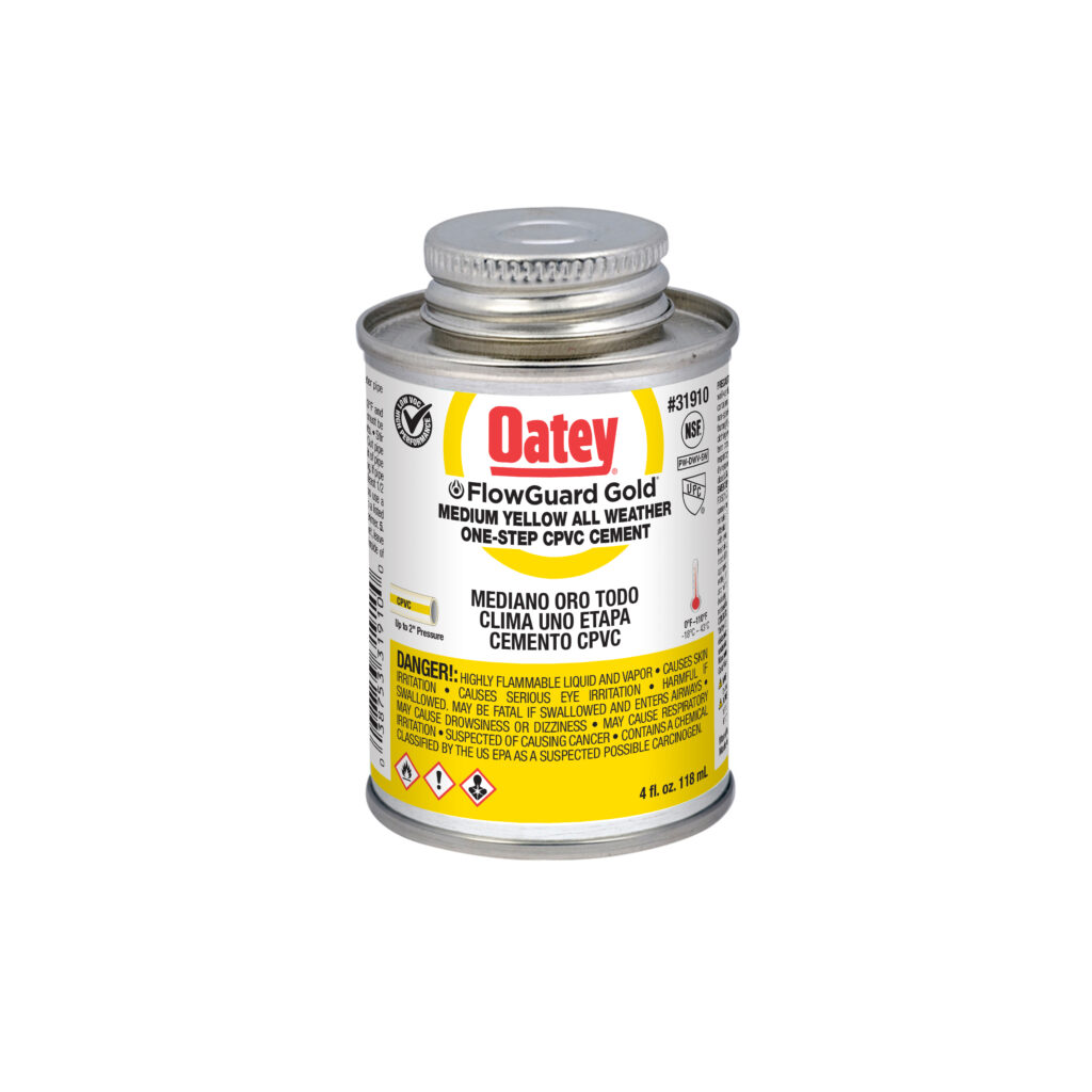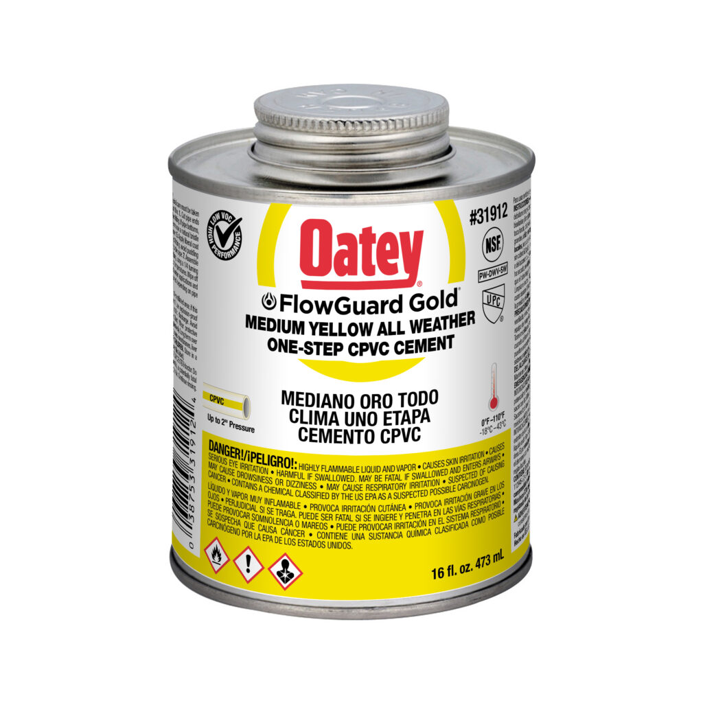 Oatey® FlowGuard Gold® 1-Step All Weather Fast Set Yellow Cement jest zalecany do instalacji wody zimnej i ciepłej o temperaturze do 93°C. Jego formuła zapobiegawcza została zaprojektowana w celu ochrony rur przed korozją. Jego średnia konsystencja ma doskonałe właściwości wypełniania szczelin i jest łatwa do nakładania za pomocą dołączonego dozownika. Ten żółty, szybkowiążący cement o niskiej zawartości LZO może być stosowany do spawania rozpuszczalnikowego rur miedzianych (CTS) CPVC do ciepłej i zimnej wody pitnej oraz kształtek o średnicy do 2 cali z pasowaniem ciasnym. Produkty Oatey cieszą się zaufaniem profesjonalistów z branży hydraulicznej od ponad 100 lat.